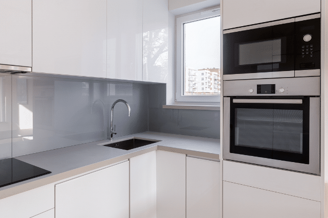 Elegante Küchenrückwand aus Glas, die klare Linien und pflegeleichte Oberflächen kombiniert und Ihrer Küche einen modernen, lichtdurchfluteten Akzent verleiht.
