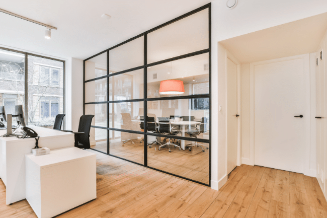 Vielseitige Glasraumteilung, die mit eleganter Optik Räume unterteilt und individuelle Zonen schafft – ideal für Office- und Privaträume, optional mit Tür.